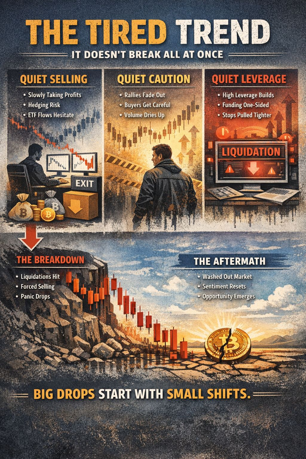 Un vero crollo raramente inizia con il crollo. Inizia con piccole cose che sembrano innocue al momento. I rialzi smettono di allungarsi. Le rotture sembrano promettenti, poi si affievoliscono. Ogni nuovo massimo richiede più sforzo e offre meno ricompensa. Gli acquirenti esistono ancora, ma non sono più impazienti. Sono cauti. Stanno aspettando un prezzo migliore. Questo non è dramma. Questo è un mercato che transita da accumulazione a distribuzione.