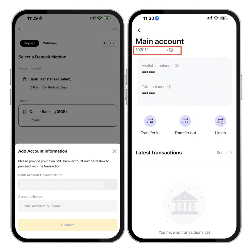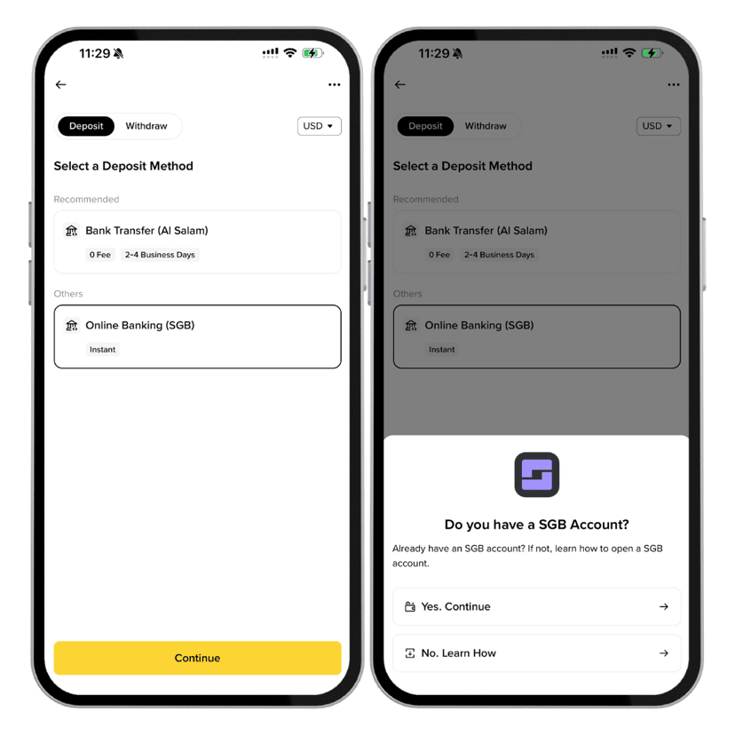 L'app della banca cambierà nella lista Crypto e apparirà il tuo conto personale di Binance Bahrain con la possibilità di depositare e prelevare