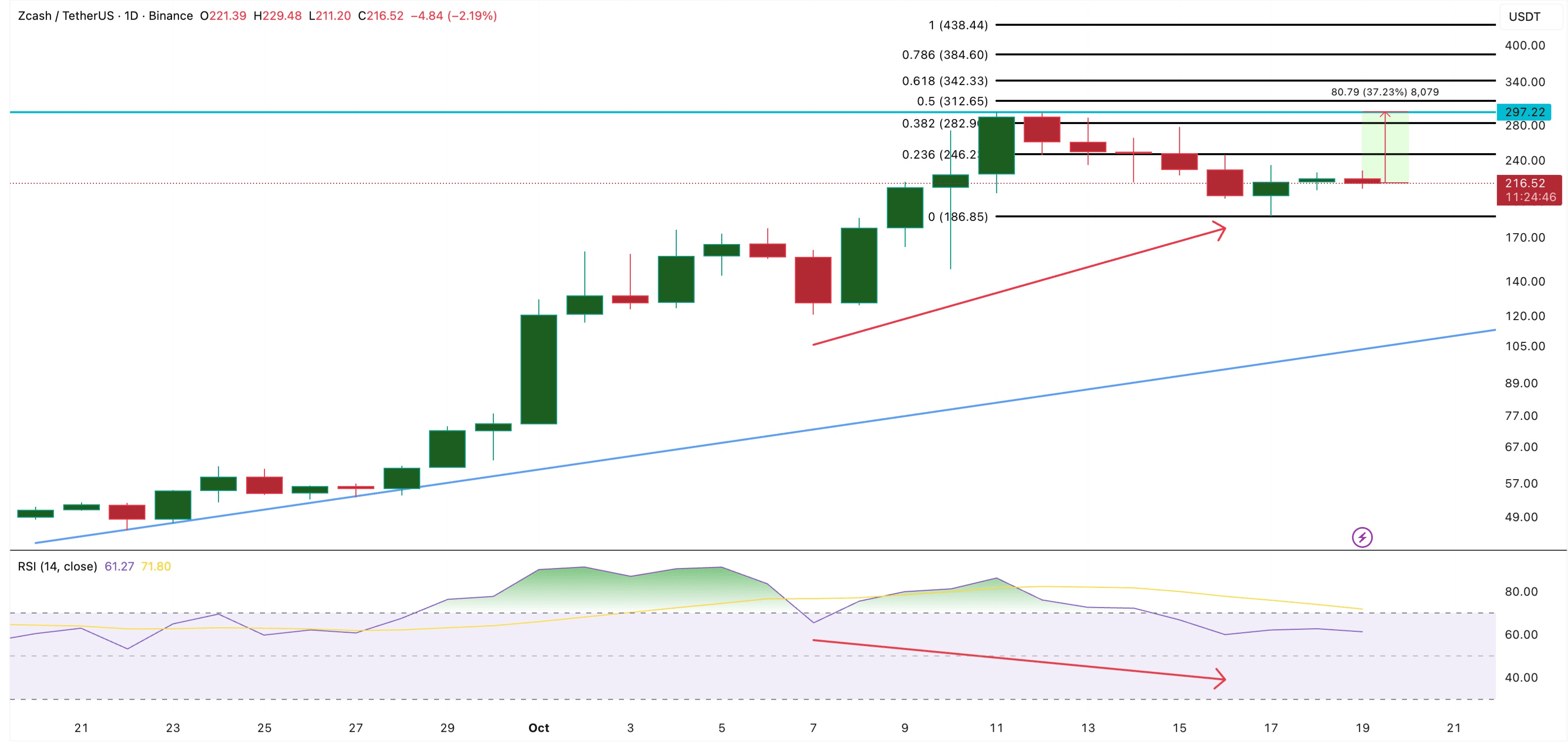 Recentemente, Zcash ha raggiunto un massimo di quattro anni sopra $297, diventando uno dei leader tra le monete di privacy in ottobre. Dopo ciò, è seguita una naturale presa di profitto e una correzione di circa il 18%, tuttavia la struttura di crescita rimane rialzista.