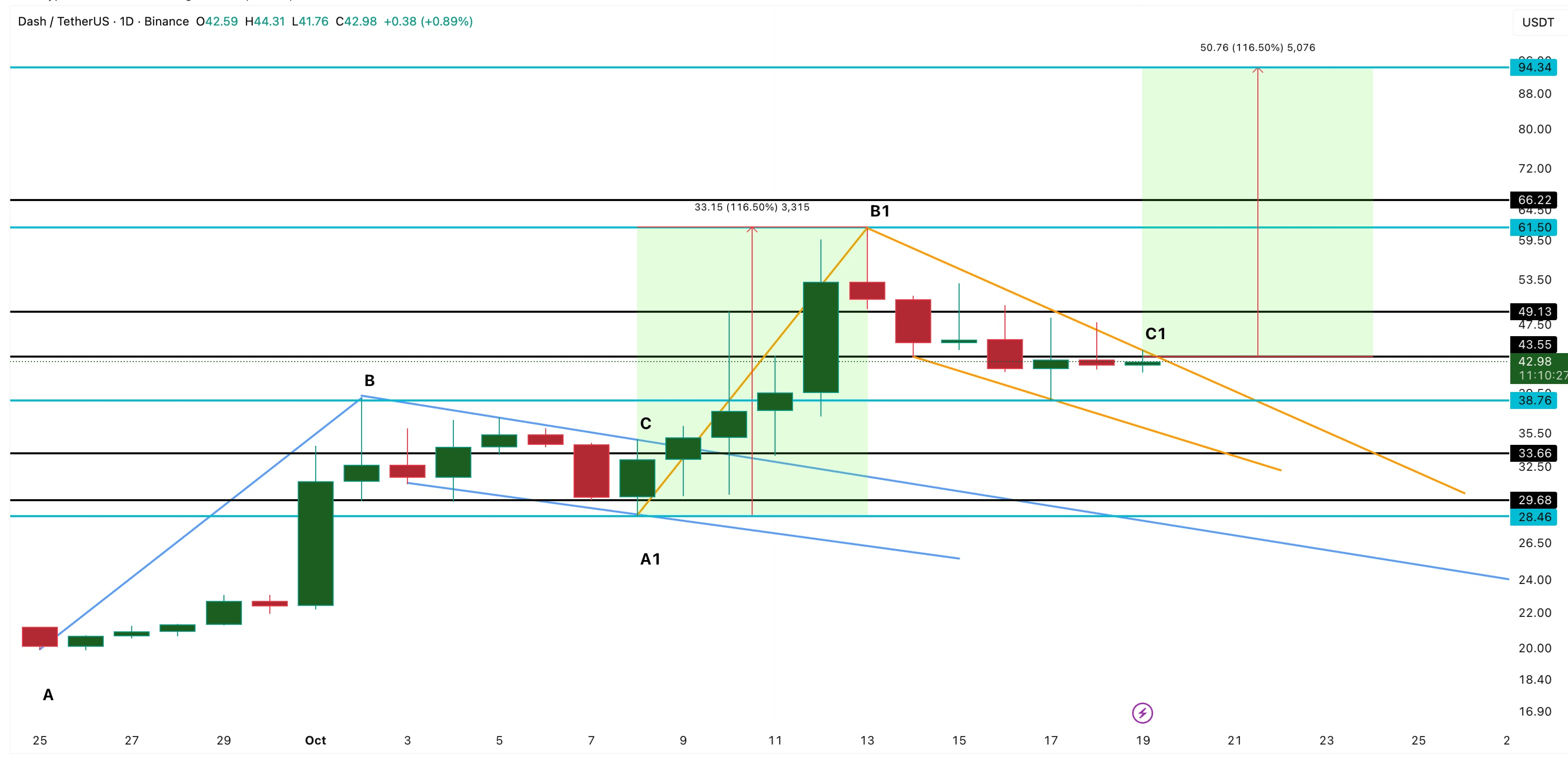 In precedenza, Dash è uscito da un modello di 'bandiera', che ha dato impulso alla crescita fino a $61 — quasi raggiungendo il target di $66. Attualmente si sta formando una nuova struttura di bandiera, che potrebbe indicare una consolidazione prima di un'ulteriore rottura.