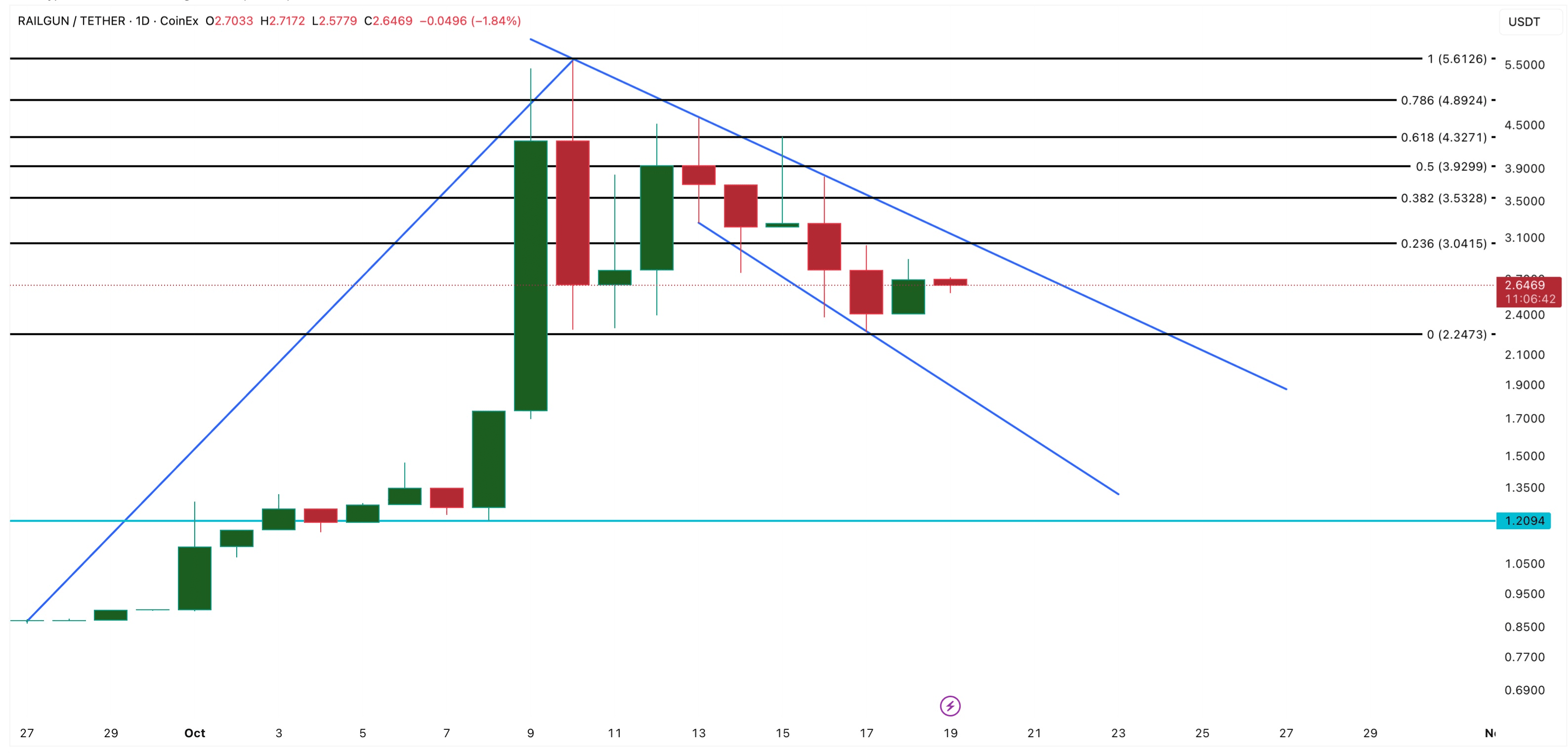 Dal punto di vista tecnico, RAIL è scambiato all'interno di un triangolo discendente — una struttura che spesso precede una rottura verso l'alto. Un consolidamento sopra i $3,04 confermerà la forza dei compratori e aprirà la strada ai $3,53, e poi ai $5,61, avvicinando il token al suo massimo storico.