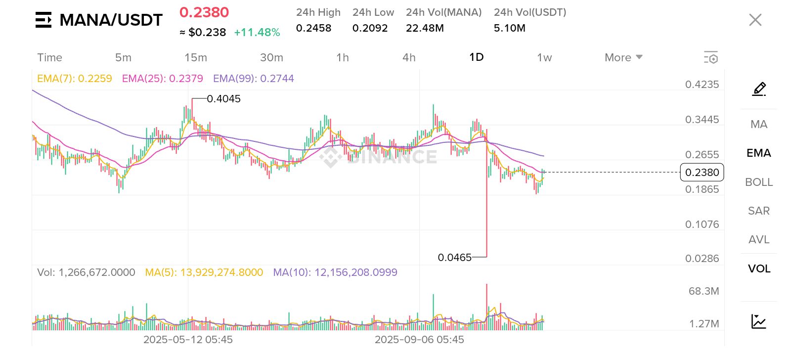 Quel grafico è un grafico Giornaliero (1D) per la #MANA/USDT coppia di trading, probabilmente da Binance, che mostra l'azione del prezzo e le medie mobili su diversi mesi nel 2025.