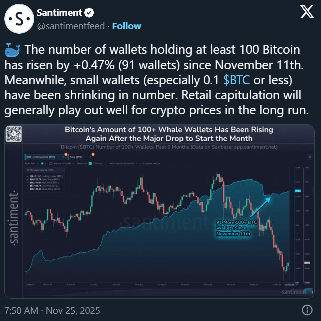 Di fronte alla diminuzione del prezzo, i grandi attori stanno aumentando le posizioni. Secondo i dati di Santiment, dal 11 novembre il numero di portafogli con un saldo di oltre 100 BTC è aumentato di 91 indirizzi.