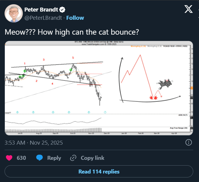 Tuttavia, non tutti i partecipanti al mercato sono ottimisti. Il trader Peter Brandt ha caratterizzato l'attuale recupero dei prezzi come un 'rimbalzo di un gatto morto' all'interno di un trend discendente più ampio.