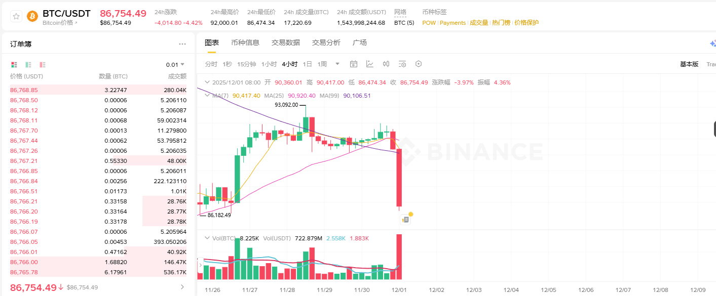 Alle 8:00 del 1 dicembre, quello che avrebbe dovuto essere il momento per accogliere un nuovo dicembre, il mercato ha invece gettato un secchio d'acqua fredda su tutti. Bitcoin e le criptovalute principali hanno inaspettatamente attivato la modalità 'crollo verticale' nel momento della chiusura mensile.