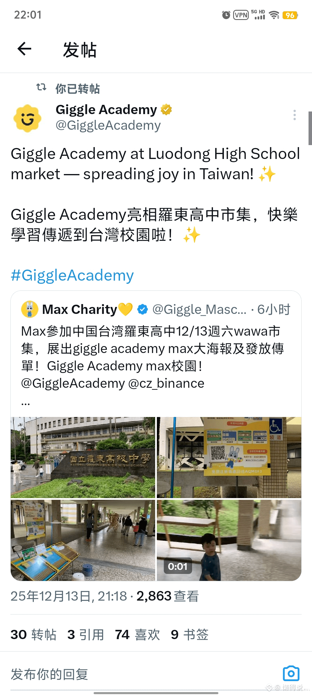 就在刚才,#GiggleAcademy 官方账号转发了@Giggle_Mascot(MAX社区)的推文,并热情地写道:“Giggle Academy at Luodong High School market — spreading joy in Taiwan!”