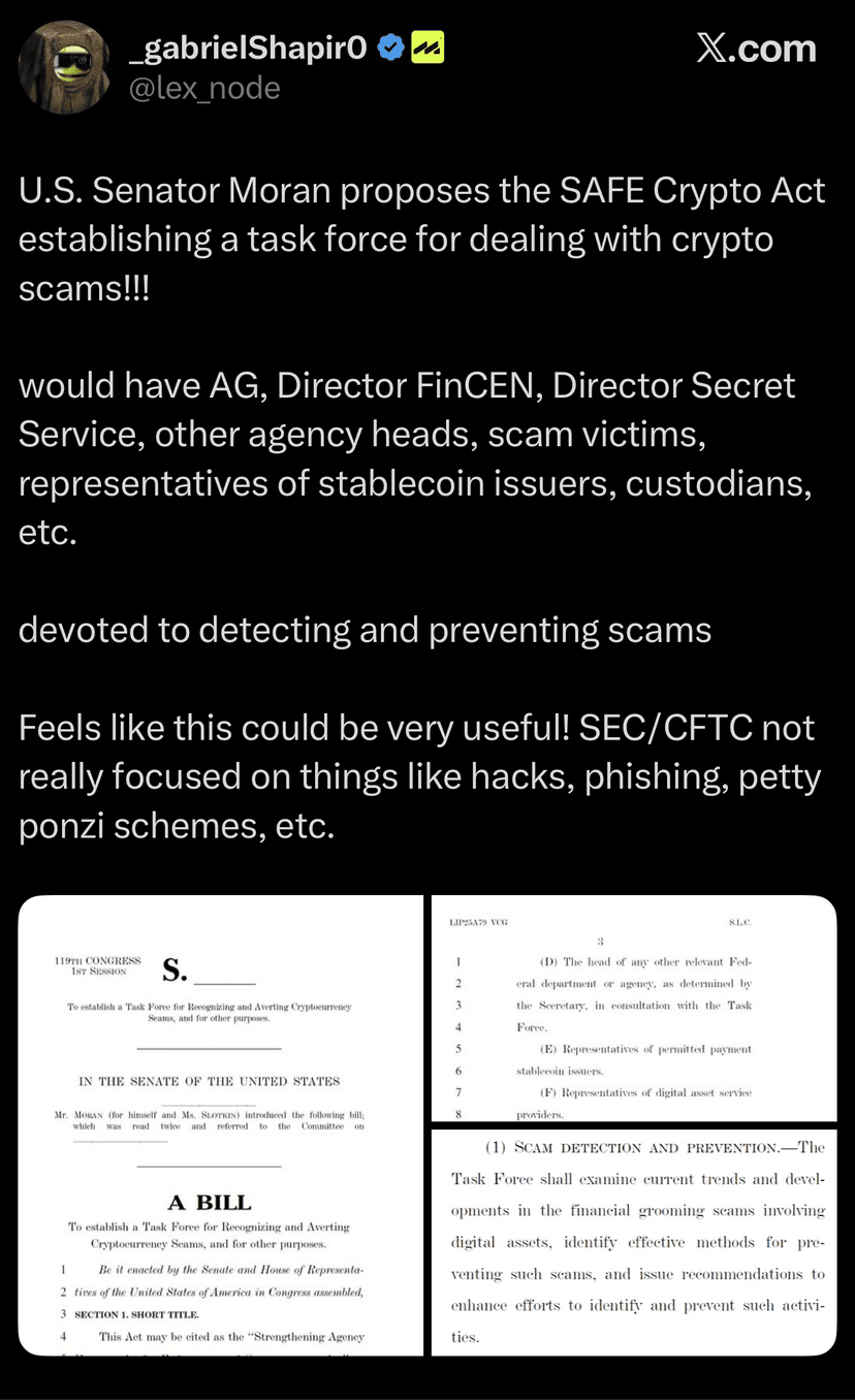 I senatori Elissa Slotkin (D-MI) e Jerry Moran (R-KS) sono elencati come i sostenitori del disegno di legge. La misura appare al Congresso sotto un titolo che stabilirebbe un “Gruppo di lavoro per il riconoscimento e la prevenzione delle truffe sulle criptovalute” ed è riferita con il numero di disegno di legge S.3428 nei registri congressuali. A partire dal 17 dicembre 2025, il testo legislativo completo non era stato pubblicato sul sito del Congresso.