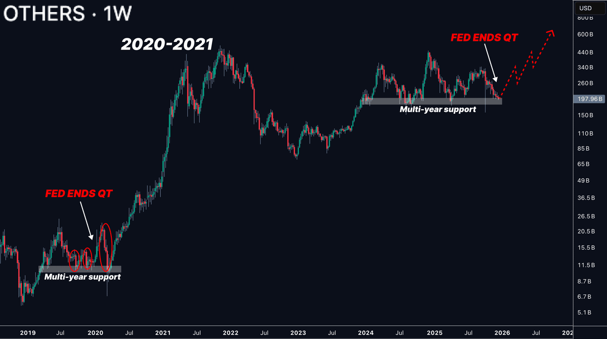 2. La capitalizzazione di mercato delle altcoin è su lo stesso supporto pluriennale di prima