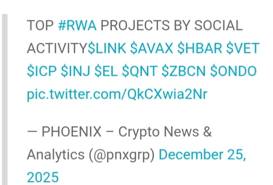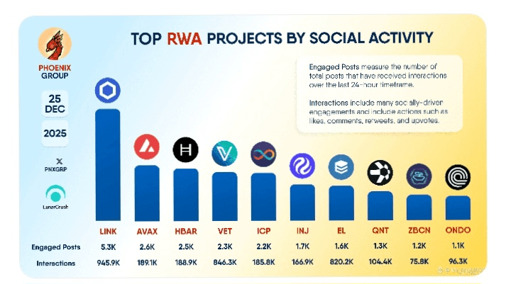 Basato su recenti analisi sociali di dicembre 2025, Chainlink ($LINK) è il leader indiscusso nelle discussioni relative a RWA, molto avanti rispetto ai suoi concorrenti.