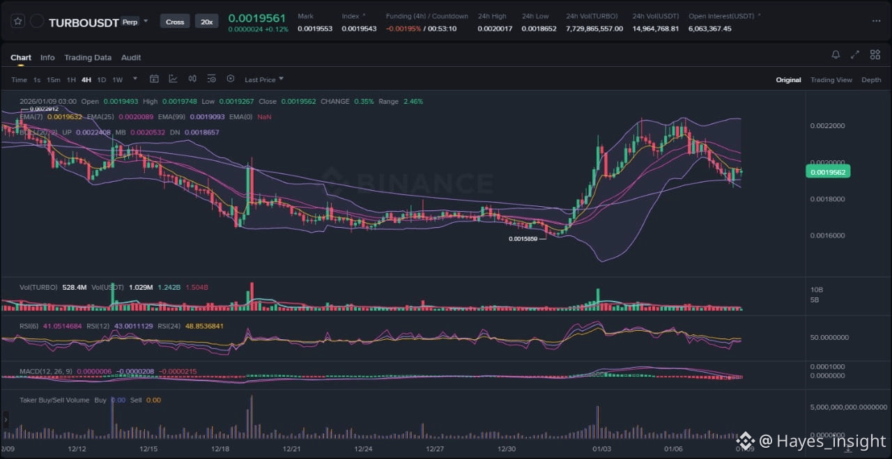 For continuation of this bullish structure, TURBO's price must hold above the recent breakout level near 0.0100, ideally forming higher lows while volume profiles confirm buyer commitment through sustained spikes above average levels. A retest of the 25-period EMA as support would solidify the uptrend, potentially leading to an extension toward liquidity pockets beyond the local swing high, where mean reversion could give way to further impulsive advances if MACD momentum accelerates. Conversely, invalidation would occur on a breakdown below the range bottom at 0.0090, signaling a fakeout breakout and possible return to consolidation or downtrend resumption, especially if RSI diverges negatively or Bollinger Bands contract sharply.