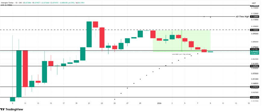 Mezzanotte (NOTTE) è attualmente il "peggiore performer" del trio, con un calo del 26% dopo aver fallito nel superare la resistenza psicologica di $0,100. Indicatori tecnici come il Parabolic SAR si sono invertiti in una posizione ribassista, rafforzando la tendenza al ribasso mentre l'asset fatica a trovare un fondo. Dopo aver perso il supporto a $0,075, NIGHT è ora vulnerabile a un ulteriore calo verso il livello di $0,0609. Sebbene un improvviso afflusso di capitale possa teoricamente innescare un rally verso il massimo storico di $1,20, la narrativa attuale di "debole domanda" suggerisce che il fine settimana potrebbe portare a una consolidazione o a ulteriori ribassi piuttosto che a una ribellione esplosiva.