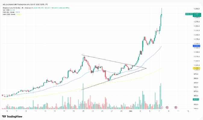 BNB ha finalmente superato il massimo storico a metà ottobre 2025—la maggior parte dei tracker lo segna intorno a 1.370 dollari, con CoinMarketCap che indica il picco esatto a 1.370,55 dollari il 13 ottobre, anche se TradingView mostra un valore leggermente più alto di 1.375,90 dollari un giorno o due prima. Quel momento è stato elettrizzante se si guardavano i grafici in tempo reale. Dopo anni di bruciature costanti e crescita dell'ecosistema, vedere il prezzo superare i precedenti massimi come quelli del 2021 era... soddisfacente, direi. Vindicate.