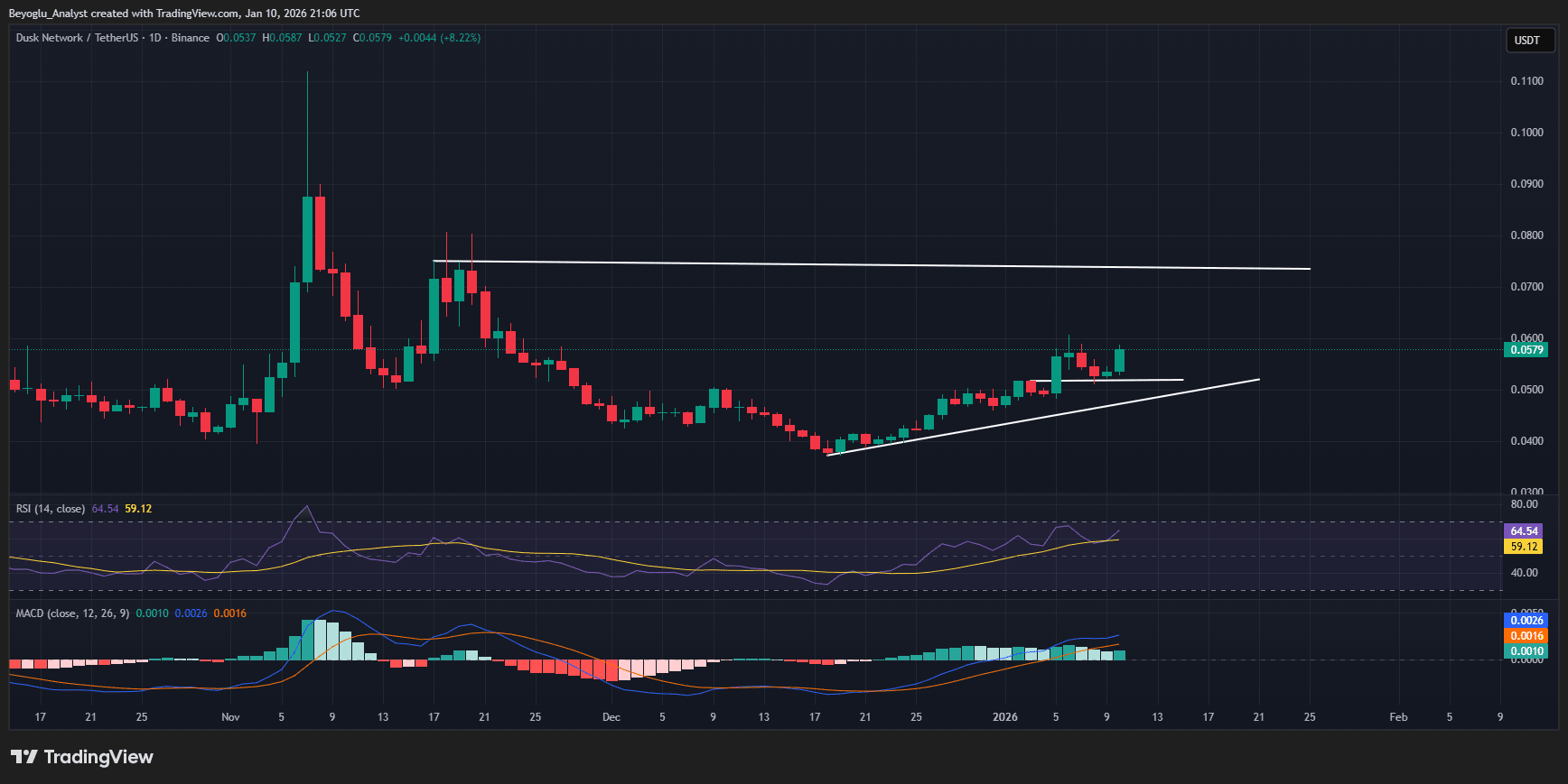 L'indice di forza relativa RSI è a 62, superiore al livello neutro, con tendenza al rialzo, indicando che il momentum rialzista è in aumento. Nel frattempo, l'indicatore MACD (Moving Average Convergence Divergence) indica inoltre un aumento della domanda su #dusk .