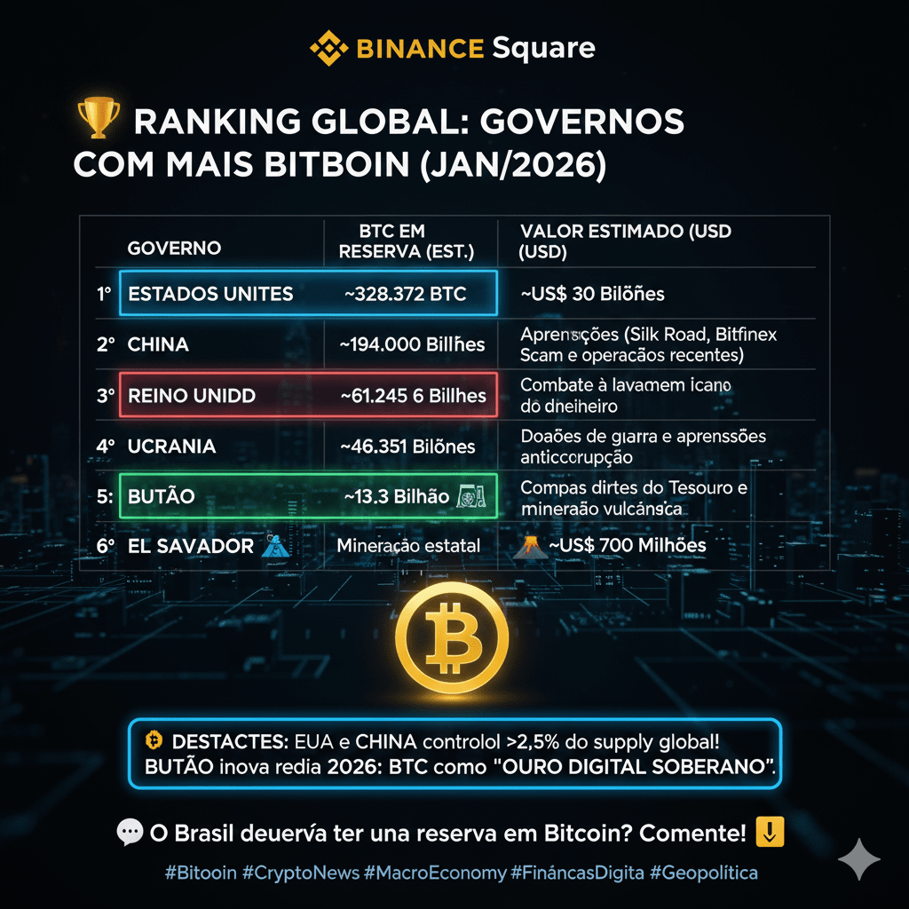 USA (La balena involontaria): Quasi tutto l'approvvigionamento americano proviene da reati. Tuttavia, nel 2026, il dibattito sulla "Riserva Strategica di Bitcoin" è al culmine. Se il governo decidesse di smettere di vendere e iniziare a accumulare formalmente, ciò cambierebbe per sempre la dinamica dei prezzi globali.
