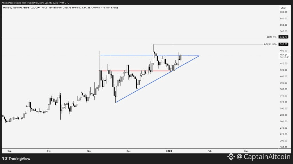 Trader Ardi points out that Monero is now printing a higher low while continuing to push into the $460 area. That level has rejected the price several times already, so it’s not surprising the market is slowing down here.