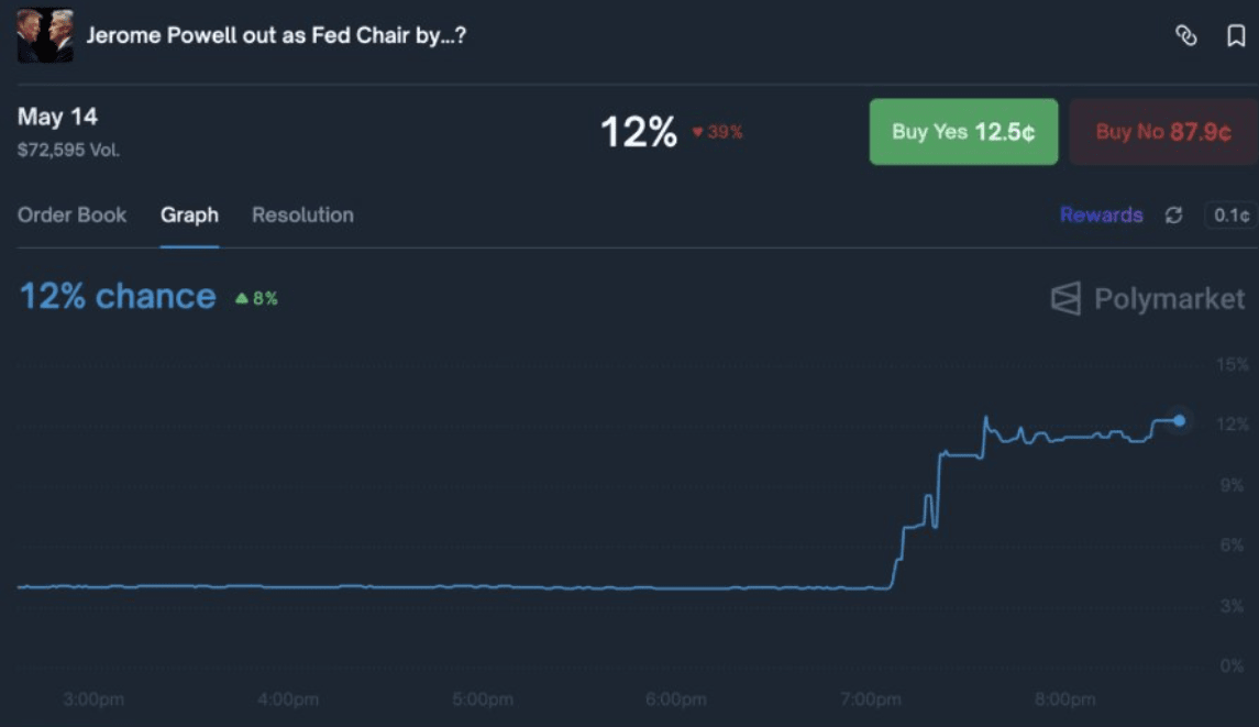 Di fronte a questa notizia, sul mercato dei tassi di interesse sono aumentate le probabilità che Powell lasci il suo incarico prima del tempo. Su Polymarket, le probabilità che Powell lasci il suo incarico prima del 14 maggio sono aumentate, alla luce degli eventi di oggi, dal 4 al 12%.
