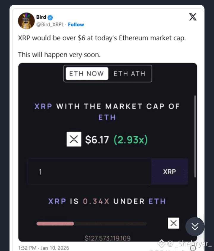 That would represent roughly a 3× increase from XRP’s price at the time of the post. The visuals also highlight that XRP’s current market cap sits at about one-third of Ethereum’s, showing a significant valuation gap between the two assets.