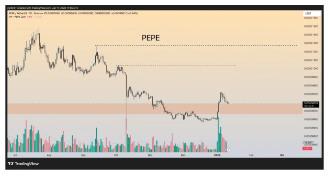 👉 Il grafico racconta una storia chiara. La forte pressione ribassista si è assorbita intensamente vicino ai minimi: puoi vederlo in quella lunga ombra al ribasso e nel picco di volume. Di solito è qui che i venditori obbligati si arrendono. Da allora, PEPE si è mantenuto stabile sopra quella zona di domanda ombreggiata mentre la volatilità si è ridotta e le candele sono diventate più piccole. I venditori non spingono più con la stessa forza.