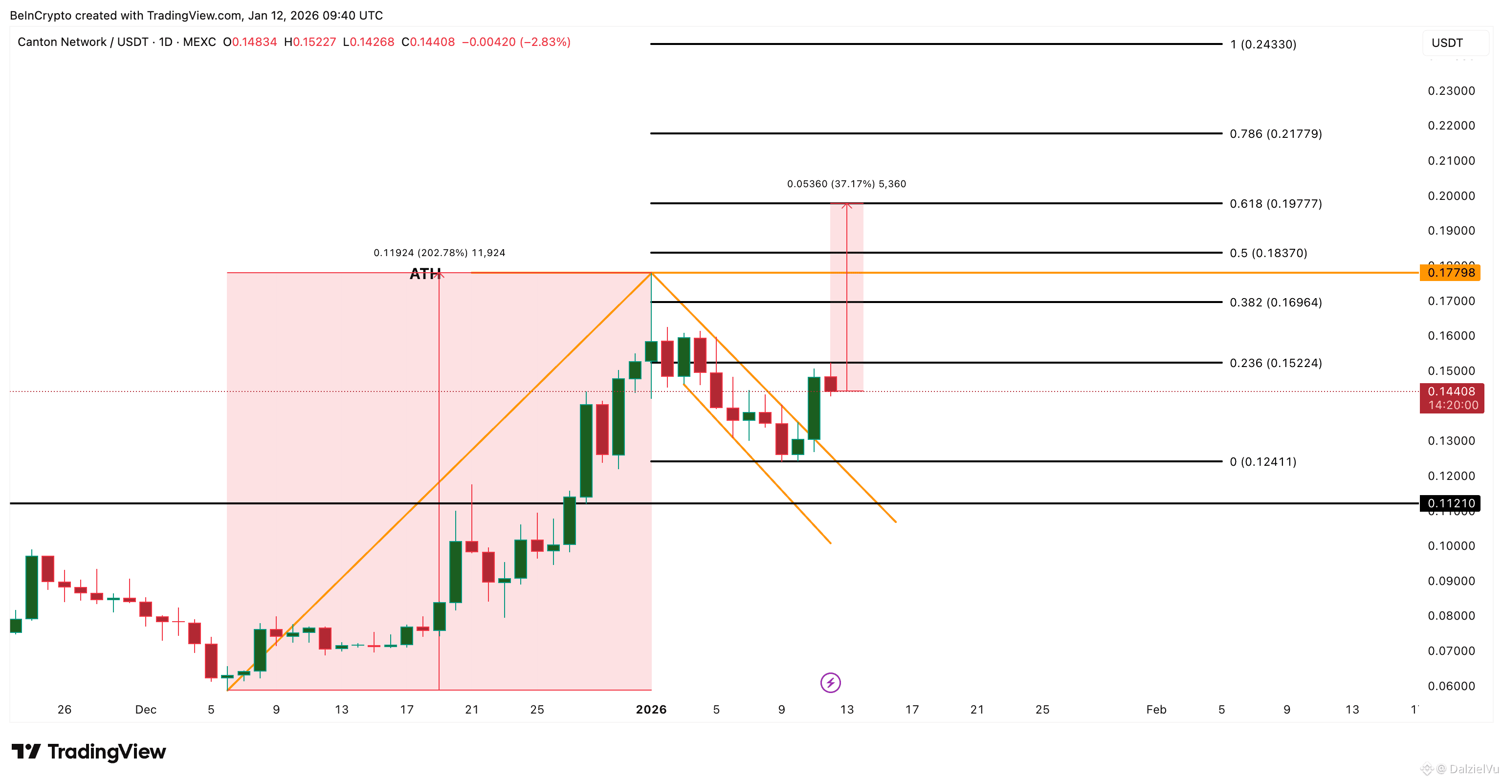 Loss of $0.124 weakens the bullish setup, with $0.112 as critical support.