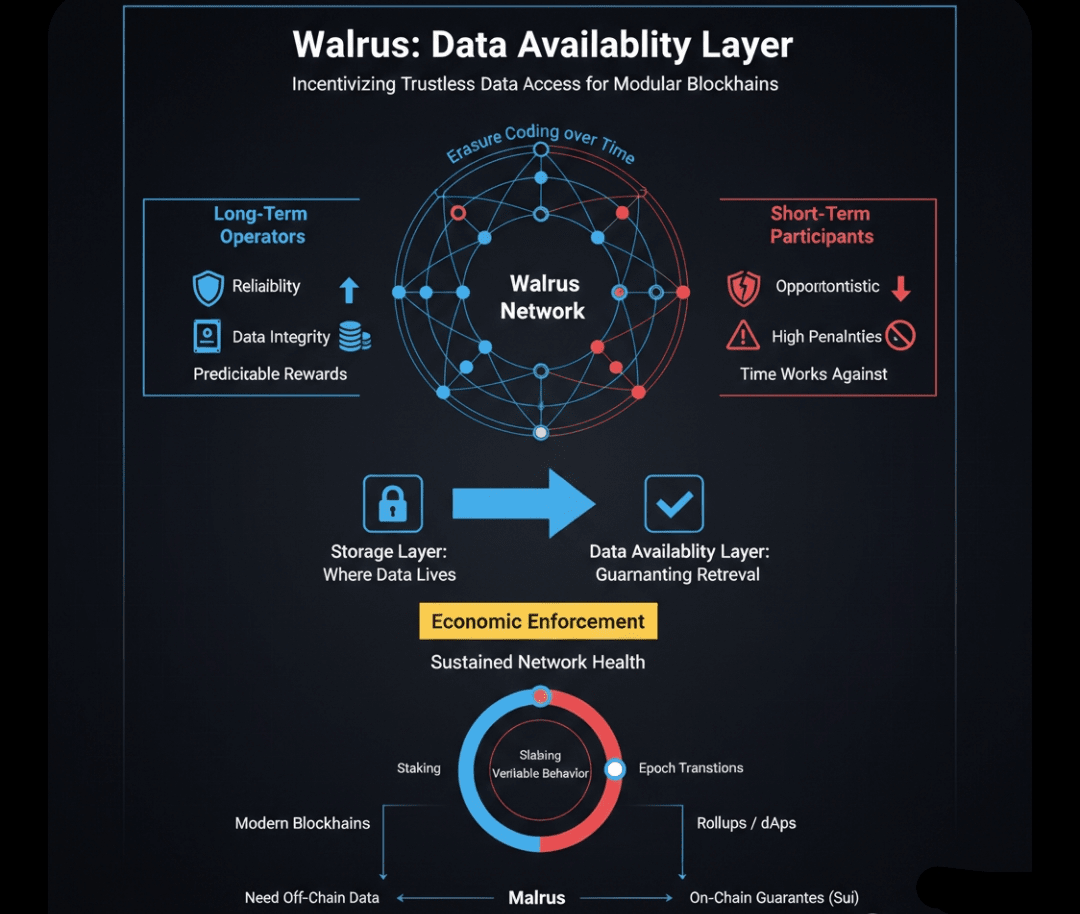 In Walrus, la disponibilità dei dati significa che la rete può garantire crittograficamente ed economicamente che i dati memorizzati rimangono recuperabili per la durata per cui sono stati pagati. Questo è un cambiamento sottile ma importante. Walrus non chiede agli utenti di fidarsi dei nodi di stoccaggio di comportarsi bene. Invece, struttura incentivi e penalità in modo che rimanere onesti sia la scelta razionale.