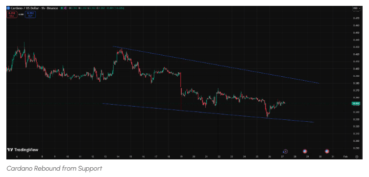 Cardano è compresso all'interno di un canale nel grafico orario, con un recente rimbalzo di supporto che mantiene vive le speranze di un breakout.