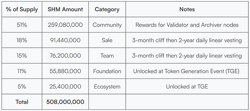 SHM avrà una fornitura massima di 508 milioni. Di seguito sono riportati i dettagli dell'allocazione dei token SHM.