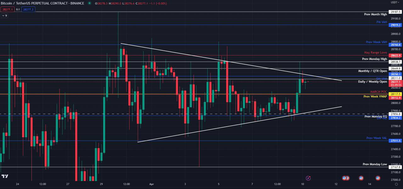 La linea di tendenza al ribasso mostra che, nonostante si sia assistito a un movimento verso l'alto, finora ha creato solo un massimo inferiore finché questo livello non verrà capovolto. Cerchiamo una chiusura sopra i 28,4k $ o sotto i 27,8k $, quindi confermiamo una rottura dal range di restringimento in cui stiamo negoziando. I mercati statunitensi riaprono oggi dopo il weekend di 3 giorni, quindi vediamo come si sviluppa il range di lunedì.