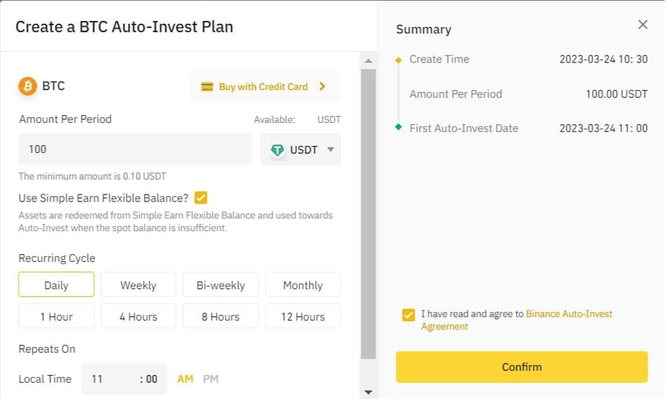 4. Dopo aver fatto clic sulla criptovaluta in cui desideri investire automaticamente, vedrai una pagina in cui devi compilare la tua strategia di investimento automatico. Nel creare il tuo piano, devi fare quanto segue.