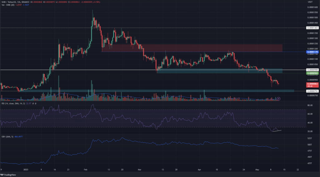 Il sentiment rialzista fatica a prendere piede nei movimenti di prezzo di SHIB. I tori si stanno sforzando di stabilire un punto d'appoggio vicino all'area di $0,0000099, che si allinea con gli ordini rialzisti di marzo.