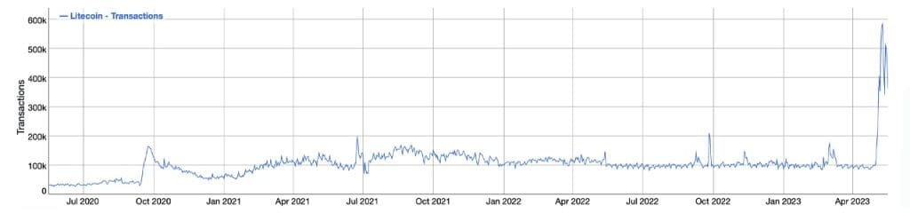 Il 6 maggio 2023, il numero di transazioni giornaliere di LTC ha superato le 400.000. Entro il 10 maggio, quattro giorni dopo, LTC aveva elaborato oltre 584.000 transazioni, come documentato da bitinfocharts.com. Solo cinque giorni dopo, il 15 maggio, i miner di Litecoin hanno verificato poco più di 500.000 transazioni. Dal 22 febbraio 2023, quando LTC ha registrato poco più di 13.000 iscrizioni ordinali, la cifra è aumentata di un impressionante 198,694% in un arco di 85 giorni.