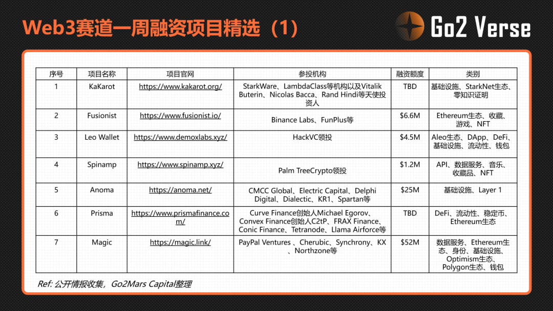 Panoramica del finanziamento settimanale è la sezione delle informazioni sugli investimenti e sui finanziamenti di Go2Mars Capital. Secondo le statistiche incomplete di Go2Mars Capital, a partire da questa domenica (29.5-6.4), questa settimana si sono verificati un totale di 14 eventi di investimento e finanziamento nel settore della crittografia globale. L’importo totale del finanziamento ha raggiunto i 138,8 milioni di dollari e il numero di finanziamenti è stato lo stesso del periodo precedente; l’importo totale del finanziamento è diminuito dello 0,07% su base mensile. Tra questi, quattro hanno raccolto più di 10 milioni di yuan, vale a dire Anoma, Magic, Illuvium e Transak.