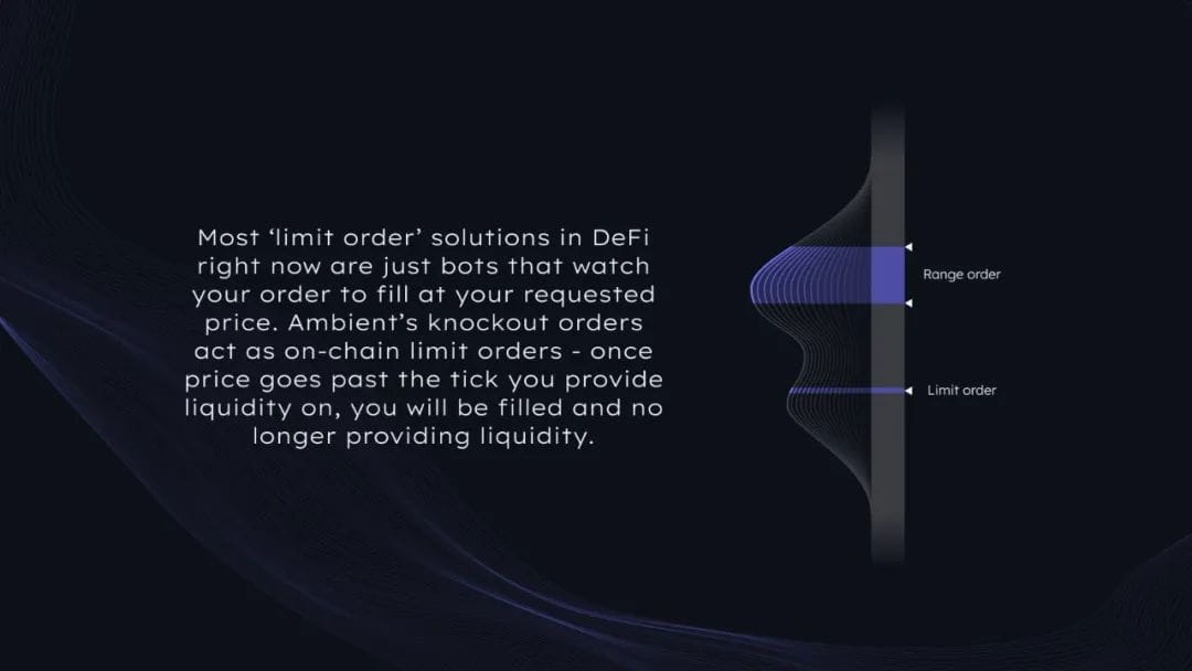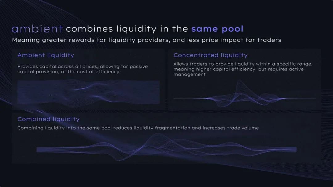 Il modello per fornire liquidità in Ambient combina le caratteristiche degli scambi decentralizzati e degli scambi centralizzati. E a differenza di altri AMM, la liquidità non è dispersa tra le coppie di trading. Ambient può anche gestire l’intero sistema DEX in un unico contratto intelligente, consentendo così commissioni di transazione più basse, maggiori premi di liquidità e un’esperienza di trading più equa. Essendo un protocollo di trading che combina le caratteristiche di CEX e DEX, Ambient introduce nuove funzionalità native DeFi per offrire agli utenti un'esperienza di prima classe.