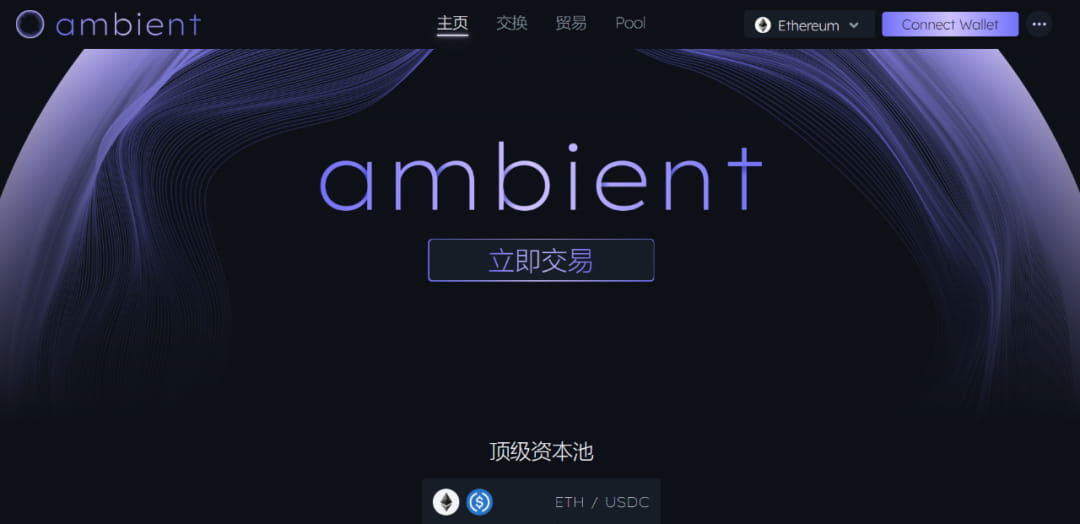 Ambient (in precedenza CrocSwap) è un protocollo di trading decentralizzato che consente un'AMM bidirezionale che combina la liquidità dei prodotti centralizzata e ambientale su qualsiasi coppia di asset blockchain. Ambient gestisce l'intero DEX all'interno di un singolo contratto intelligente, in cui un singolo pool AMM è una struttura dati leggera anziché un contratto intelligente indipendente. Questo design rende Ambient il DEX basato su Ethereum più efficiente attualmente.
