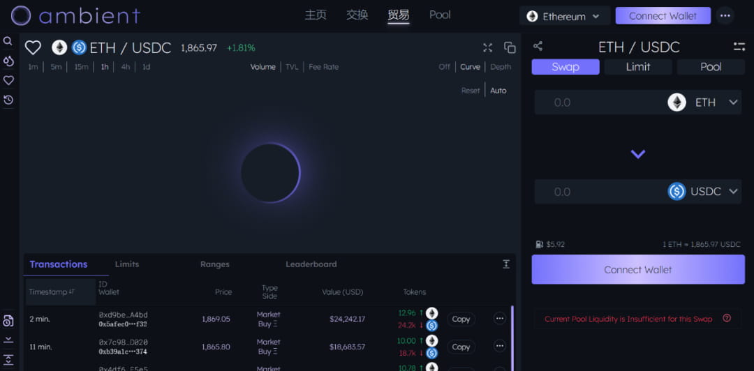 La funzionalità principale di Ambient è consentire agli utenti di scambiare un tipo di token con un altro a un prezzo di mercato equo. Se esiste liquidità per una determinata coppia di valute nel contratto DEX, gli utenti potranno scambiare token. Inoltre, le applicazioni web front-end forniscono interfacce per scambi di carattere generale.