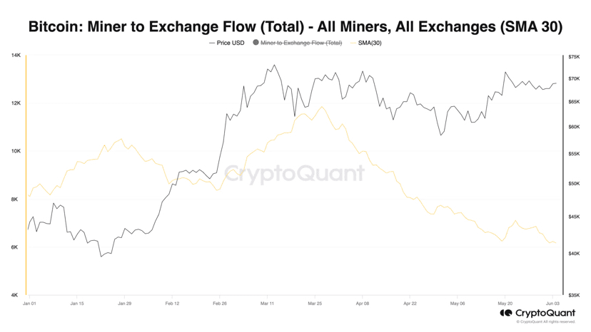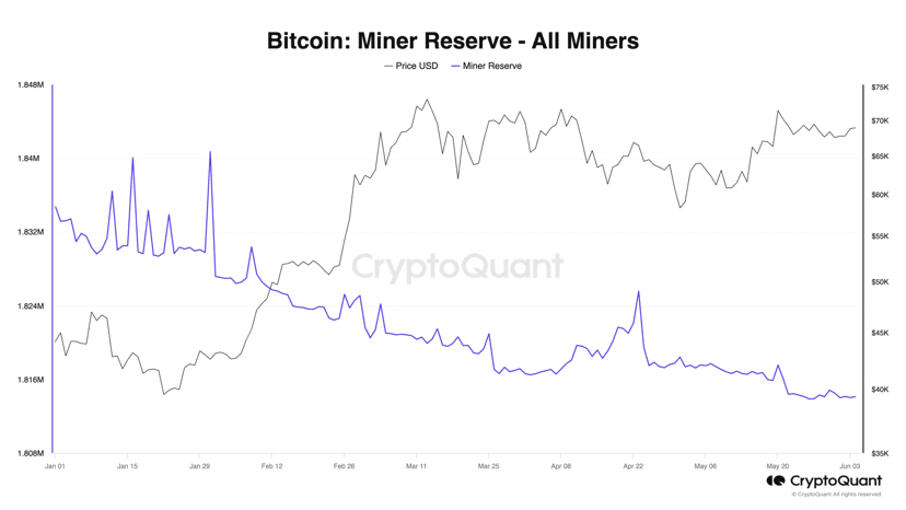 Le riserve minerarie di Bitcoin sono scese al livello più basso dall'inizio dell'anno, indicando una tendenza crescente di svendite di monete da parte dei minatori. Bitcoin è salito a 70.700 dollari, segnando il suo prezzo più alto in quasi due settimane.
