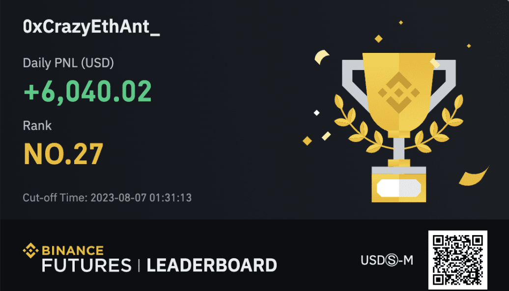 0xCrazyEthAnt è rapidamente cresciuto nella comunità crittografica, con un seguito di 9,5k su Twitter (@CrazyEthAnt_). Le sue capacità di trading sono evidenti mentre fa trading pubblicamente su Binance, vantando un impressionante profitto di 1,2 milioni quest'anno. Con un ROI giornaliero del 4,44% e un PNL giornaliero di 6K.