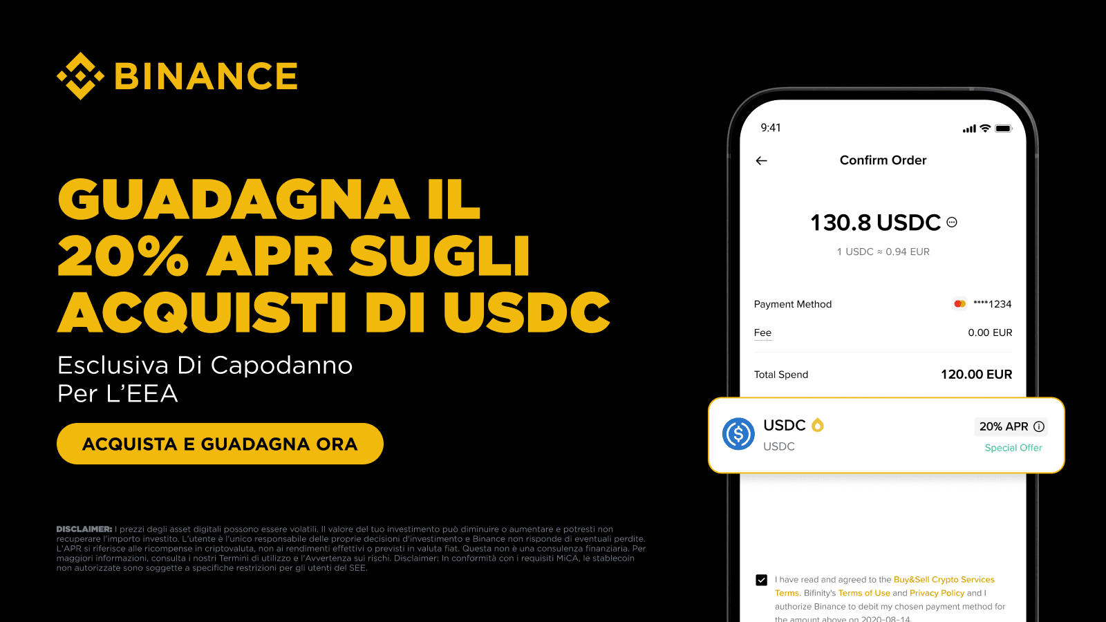 I premi APR sono distribuiti da fondi propri di Binance e sono determinati sulla base della valutazione delle condizioni di mercato attuali. Questa promozione non è in alcun modo associata all’emittente di USDC.