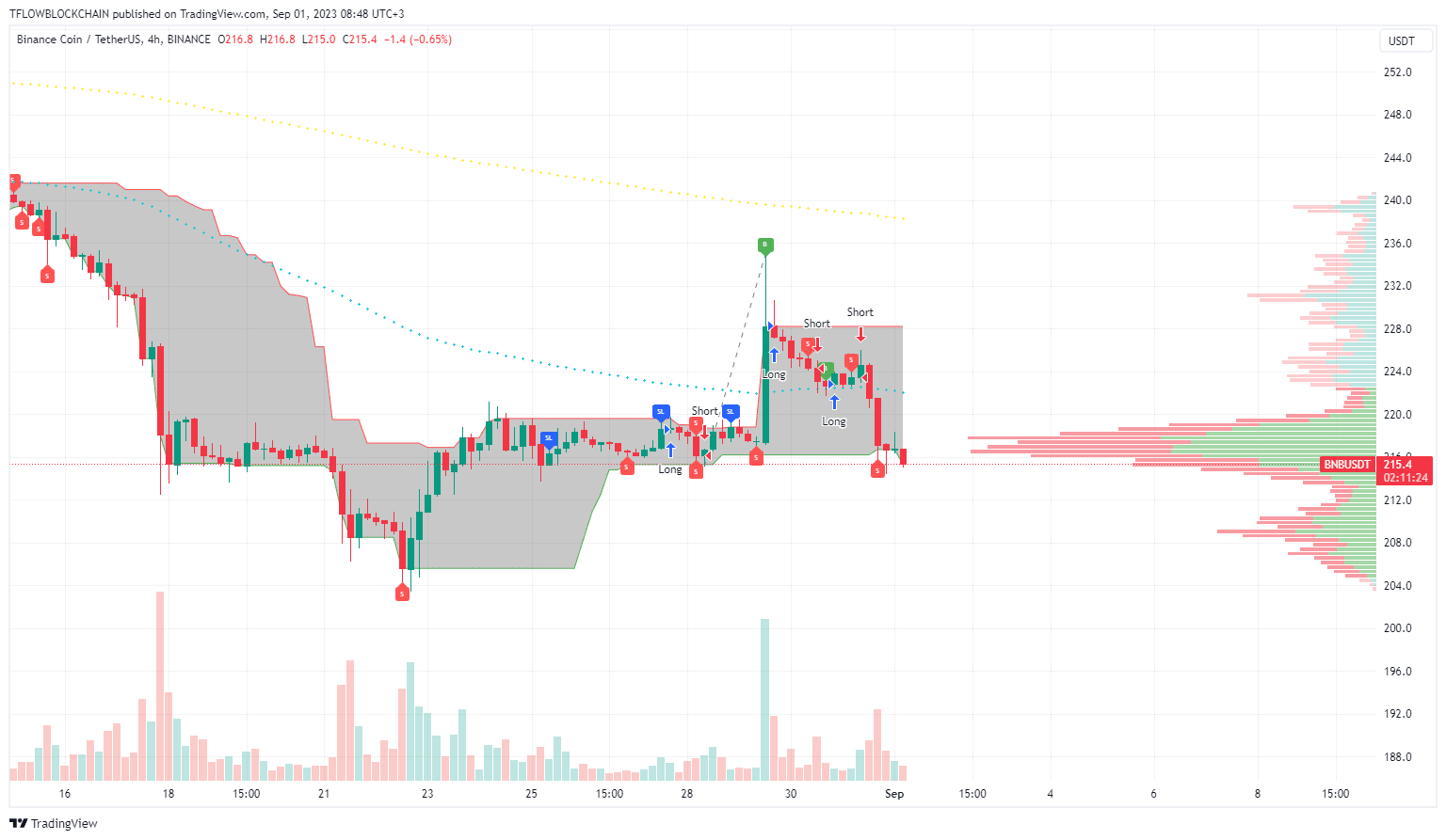 BNB is on a short mode and trying to balance at the support level of the Volume Profile Indicator.
