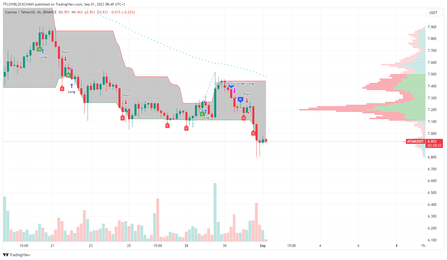 ATOM is on a short mode and trying to balance at the support level of the Volume Profile Indicator.