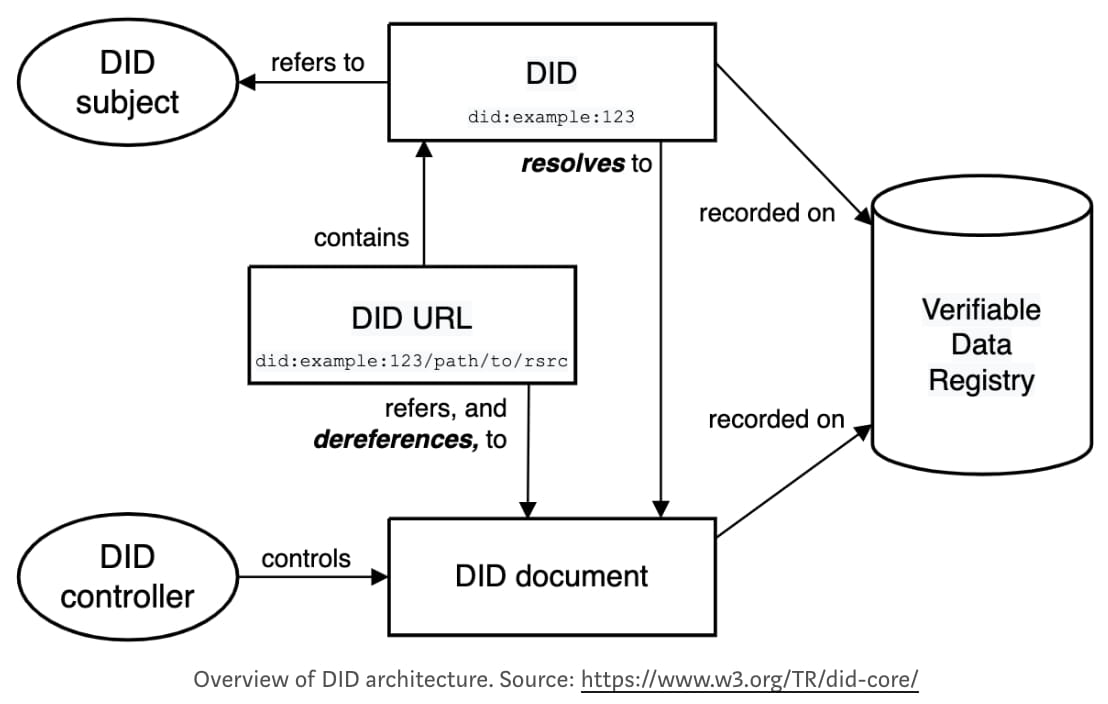 DID: 分散識別子は、スキーム did、メソッド識別子、および DID メソッドによって指定された一意のメソッド固有の識別子の 3 つの部分で構成される URI として定義されます。DID は DID ドキュメントに解決可能です。