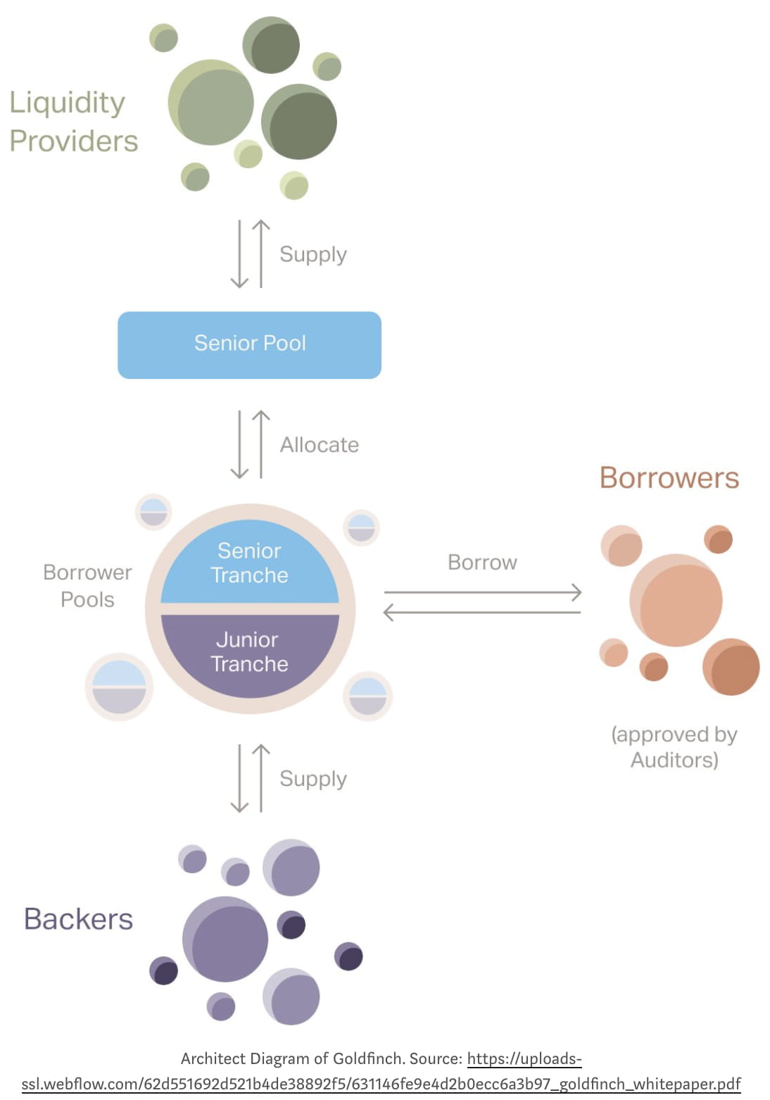 Goldfinch は、現実世界のビジネスと暗号資産市場を結びつける貸付プロトコルです。このプロトコルは、「コンセンサスによる信頼」と呼ばれる原則に基づいており、借り手は暗号資産ではなく、他の参加者の集合的な評価に基づいて信用力を示します。この信用システムは完全にオンチェーンではありませんが、オフチェーンの法的契約と組み合わされているため、DeFi における DID システムの適用範囲が拡大しています。