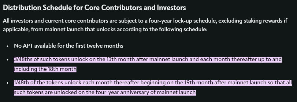 VCに「投げ売り」されるのを避けるためには、いつ売却できるかを理解する必要があります。通常、この情報はホワイトペーパーに記載されています。以下はAptos(APT)の例です。