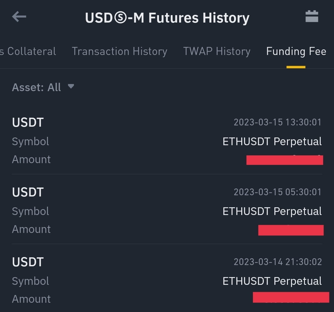 先物注文履歴の資金調達手数料タブには、未決済ポジションに対して支払われる、または支払う資金調達手数料が表示されます。