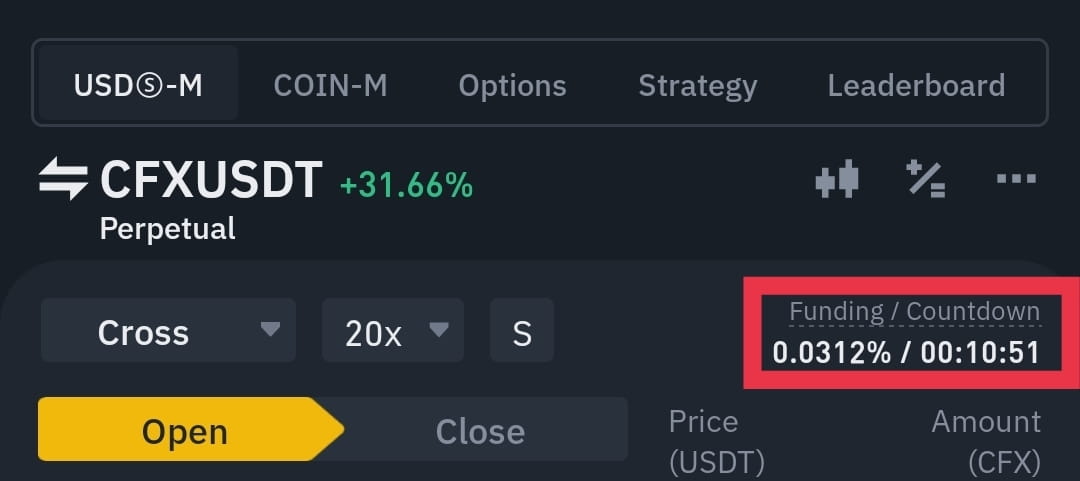 ► 正および負の資金調達率: たとえば、上のスクリーンショットの CFX/USDT ペアの資金調達率は 0.0312% で、これは正の資金調達であり、市場にはオープン ショート ポジションよりもオープン ロング ポジションが多いことを示しています。このような場合、8 時間ごとのカウントダウン更新ごとに、ロング トレーダーはショート トレーダーに一定の手数料を支払い、この手数料はそのロング注文のオープン マージンから差し引かれます。