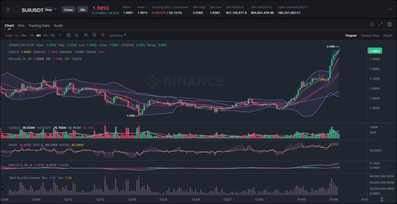 SUI/USDTペアの添付チャートを調べると、現在の構造は、レンジバウンドの統合から上昇トレンドに移行する多月の上昇三角形パターンからの確認されたブレイクアウトを示しています。価格は主要な移動平均を超えて急上昇しており、7期間EMAが25期間EMAを強気にクロスし、両方とも現在99期間EMAの上に位置しており、強気の整合性を確認しています。ボリンジャーバンドはボラティリティの拡大を示しており、価格は12月の安値からの急激な衝動的な動きの後、上部バンドに寄り添っており、平均回帰ではなく持続的な買い圧力を示しています。観察可能な要素には、1.40でのローカルスイングロー、下部バンドサポートの拒否、1.80の抵抗を突破したボラティリティ拡大キャンドルがあり、今はサポートとして機能しています。また、最近の1.95の高値のすぐ下での統合の証拠があり、フラッグパターンを形成しており、継続の可能性を示唆しています。