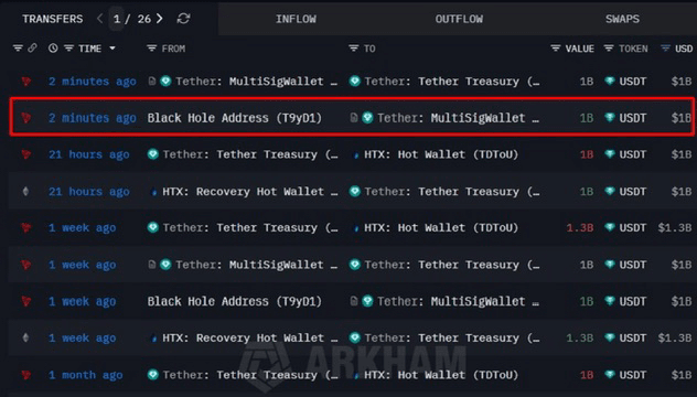 Arkham Intelligenceはこの発行プロセスを監視し、テザーのマルチシグネチャウォレットから自社のトロン上の財務保管ウォレットへの送金を確認しました。これは、テザーが需要の増加に備えて、すでに使用可能なUSDTを保有していることを意味します。このような大規模な発行は、近い将来取引活動が活発化する可能性を示唆することが多いです。