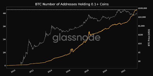 0.1 BTC以上を保有するビットコイン投資家の数が428,0062という新たな過去最高に達しました。この新たなマイルストーンは、グラスノードのチームによって記録され、ビットコイン投資家のこのカテゴリーの成長を視覚的に示す次のチャートが共有されました。