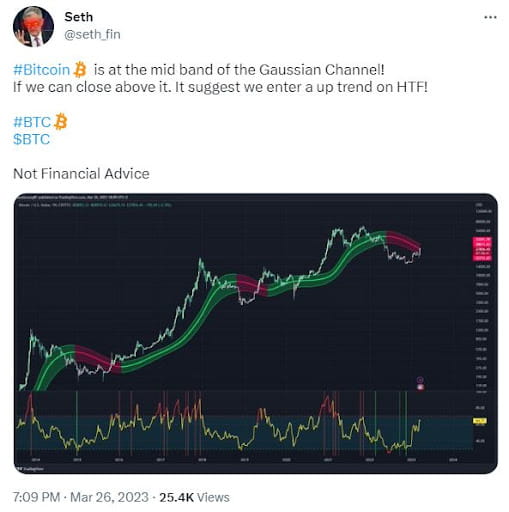 0.1 BTC以上を保有するアドレスの数が過去最高に達するのは、ますます多くのビットコイントレーダーがBTCのブルランが近づいていると楽観的な見方を示している時です。例えば、週末に行われたツイートで、暗号通貨Twitterコミュニティのメンバー@seth_finは、ビットコインが高い時間枠で上昇トレンドに入っていると予想しました。彼らの分析は、BTCがガウスチャネルの中間バンドを上回って週を終えようとしているという事実に基づいていました。
