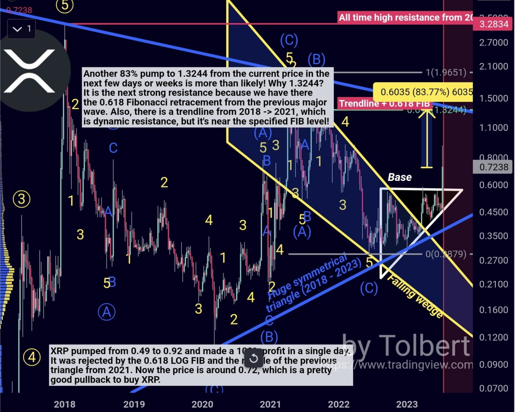#XRP は週足チャートで下降ウェッジパターンと上昇トライアングルパターンをブレイクできたため、非常に強そうに見えます。最近の強気のニュースと合わせて、SEC訴訟で裁判官がリップルに大勝をもたらした後、XRPコインは急騰した。
