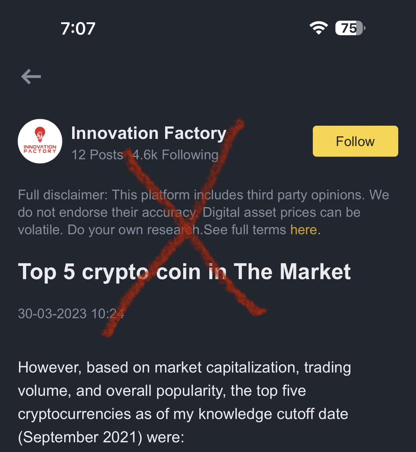 Nesen kāds Binance plūsmas lietotājs kopīgoja rakstu, kurā apgalvoja, ka ir atklātas BFIC Crypto 5 labākās monētas, un šķietamais rangs ir pretrunā ar faktisko reitingu vietnē CoinMarketCap. Tomēr mēs vēlamies brīdināt lietotājus, ka šis raksts ir viltots un tam nevajadzētu uzticēties.
